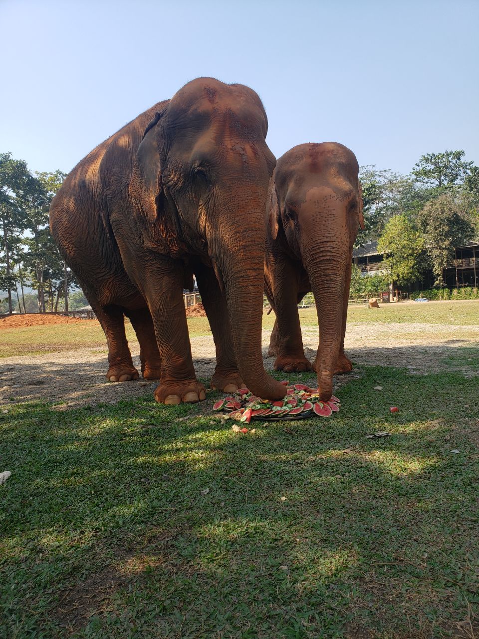 Me and everyone else made two elephant cakes! You basically arrange elephant food on a huge circular platter, maybe 3 ft across. Nobody wanted to mix the “dough” with their hands, which was rice, bananas, baked potatoes, tarot and corn, so myself and a girl from Czech Republic stepped up. I shaped my weird mush into an elephant and a baby elephant shape, and other people chopped all the fruit and arranged it around the elephants to look like a sky and the grass. It turned out quite nice! We gave one cake to a newly rescued elephant, who is only 15 years old but very skinny becauseof her previous owner, and one to a grandma elephant who loves cake and soft foods. She shared it with her best friend, another grandma. It was fun to watch them devour our carefully crafted cakes haha.
